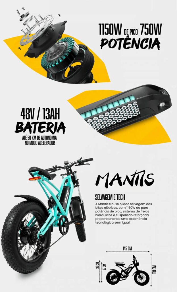 A Mantis trouxe o lado selvagem das bikes elétricas, com 1150W de pura potência de pico, sistema de freios hidráulicos e suspensão reforçada, proporcionando uma experiência tecnológica sem igual.